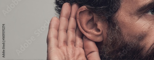 © Studio Nova, Fototapeta premium The man listening intently with hand cupped to ear in a thoughtful gesture.