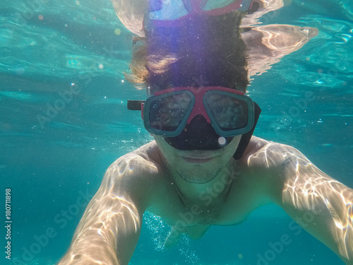 © Goldream, Fototapeta premium The man with the underwater mask is engaged in diving