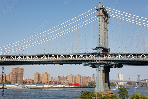 © Euqirneto, Obraz premium The Manhattan Bridge tower closest to Brooklyn over the Hudson river. Taken in New York City on September the 28th, 2019