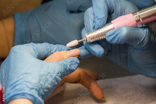 © Malyeuski Dzmitry, Fototapeta premium The manicurist processes old gel varnish a mill