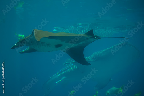 Fototapeta premium The manta ray swims with a grace unmatched, its wings cutting through the water like the flutter of an ocean breeze, Georgia Aquarium, Atlanta, Georgia, United States of America