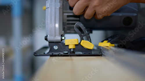 Fototapeta premium the master works with a manual circular saw on wood, close-up