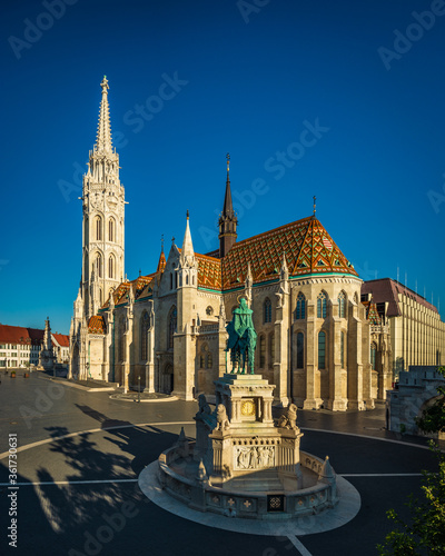 © Dmitrii, Obraz premium The Matthias Church (Church of the Assumption of the Buda Castle), is a Roman Catholic church located in Budapest, Hungary, in front of the Fisherman's Bastion at the heart of Buda's Castle District