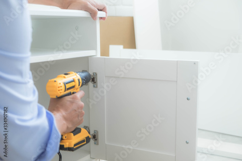 © ntinai, Obraz premium The mechanic assembled the furniture in the house according to the manual, along with the mechanic equipment. By hammering the nails Measuring with a tape measure Screwing the screw Drilling holes.
