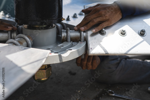 Fototapeta premium The mechanic is assembling the fan blades of the water tower system.
