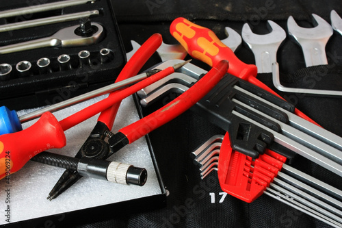 Fototapeta premium The mechanic's locksmith tool lies on the workbench