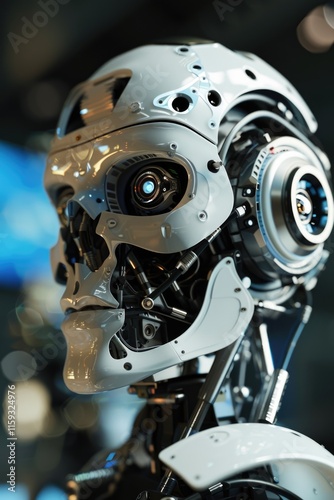 Fototapeta premium The mechanical head of a robotic figure with intricate wiring and circuitry...