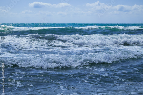 Fototapeta premium The Mediterranean Sea with raging waves on a summer sunny day. Valencia, Alicante, Spain.ean