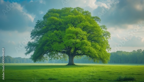 © AbstractAI, Fototapeta premium The mighty oak tree standing alone in a lush green meadow beneath a cloudy blue sky