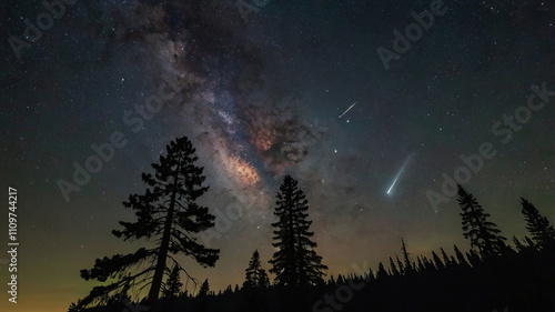 © korn, Fototapeta premium The Milky Way over a pine forest before sunrise.