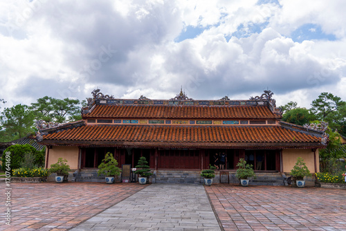 © Nhan, Fototapeta premium The Minh Lau pavilion, a long, single-story building with a red-tiled roof and dragon ornaments, stands centered on a brick courtyard under a cloudy sky at Minh Mang tomb, Hue.