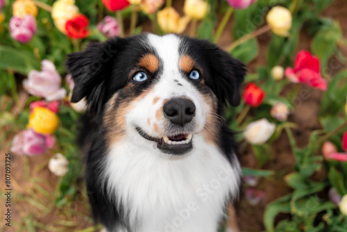Fototapeta premium The Miniature American Shepherd dog sitting and looking up. Dog in flower field. Blooming. Spring. Blue eyes dog