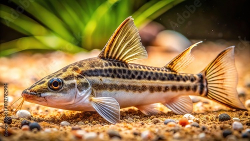 © PomPam, Fototapeta premium The miniature Otocinclus Macrospilus, a peaceful algae scraper, rests calmly on the tank's sandy floor.