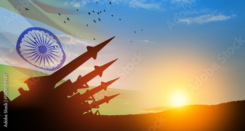 Fototapeta premium The missiles are aimed at the sky with birds at sunset with Indian flag....