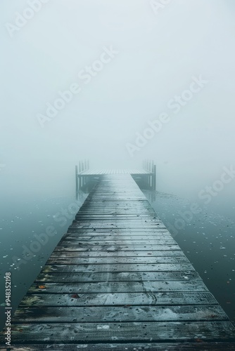© CaptainMCity, Fototapeta premium The misty dock is beautifully positioned over the water during the tranquil early morning hours