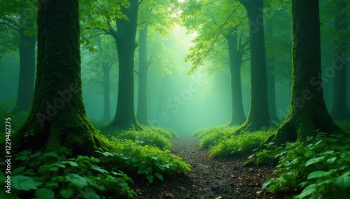 Obraz premium The misty forest floor hides the trees' roots, green, evergreen