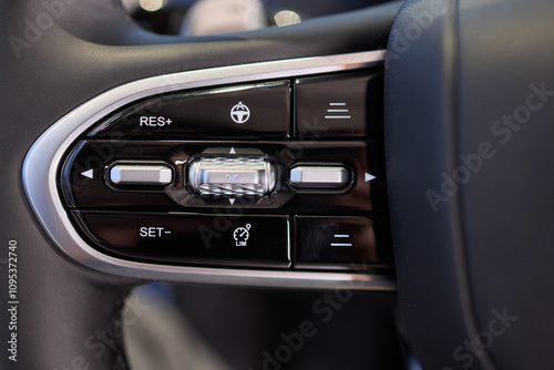 © Евгений Вершинин, Fototapeta premium The modern cars steering wheel control panel boosts convenience and performance