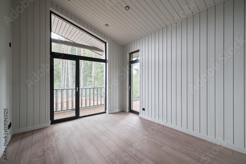© diczman, Fototapeta premium The Modern Interior of an Unfurnished Room featuring Large Windows for Ample Light