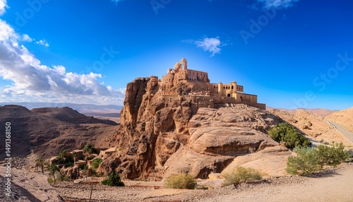 Fototapeta premium the monastery rising on a rocky mountain in the desert under a blue sky