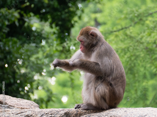 Naklejka premium The monkey is sitting on a rock.