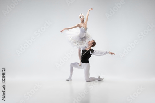 Fototapeta premium The moon. Graceful classic ballet dancers dancing isolated on white studio background. Couple in tender white clothes like a white swan characters. The grace, artist, movement, action and motion
