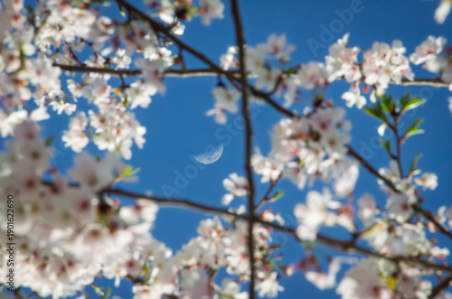 © Alan, Obraz premium The moon is framed by the branches and blossoms of a cherry tree in spring