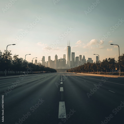 Naklejka premium The morning scene features an asphalt road square, city skyline, and modern...