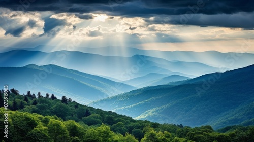 Obraz premium the morning sun shines through the clouds on the mountains of the valley and...