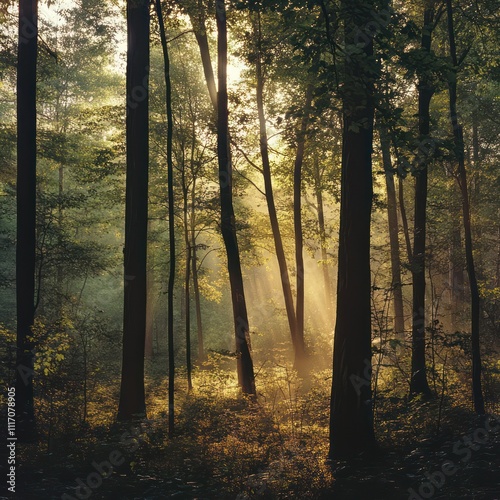 Fototapeta premium The morning sunlight penetrates and illuminates the misty forest, visible...