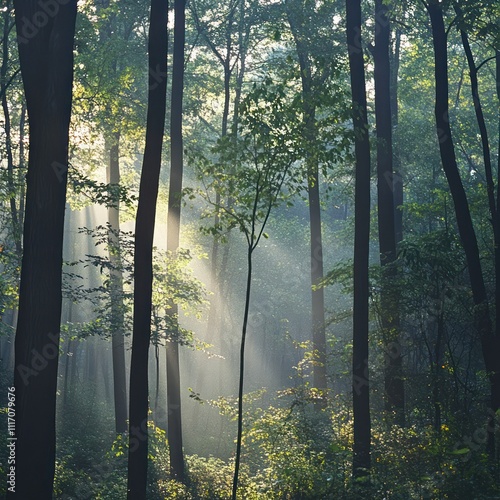 Fototapeta premium The morning sunlight penetrates and illuminates the misty forest, visible...