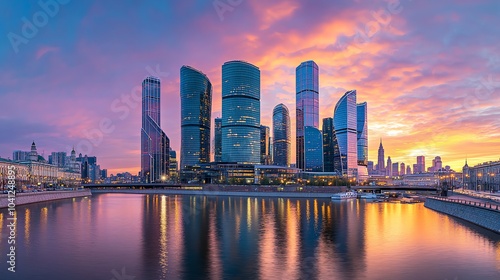 Fototapeta premium The Moscow skyline at sunset, with the Moskva River reflecting the city lights.