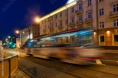 Obraz premium The motion of a blurred tram in the evening.