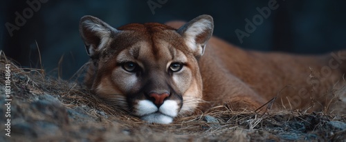 Naklejka premium The mountain lion is a silent shadow lounging lazily on the ground.