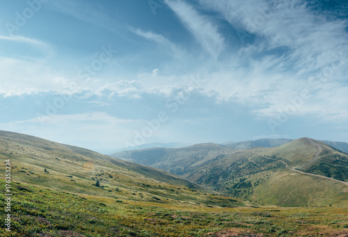 © nazariykarkhut, Naklejka premium The mountain view with the nice sky in the warm sun light