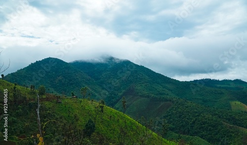 Fototapeta premium The mountains are covered in lush green trees and the sky is cloudy