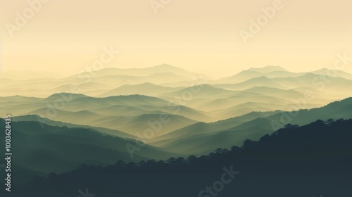 © Cloudyew, Obraz premium The mountains are covered in trees and the sky is a light blue color. The mountains are very tall and the trees are very green