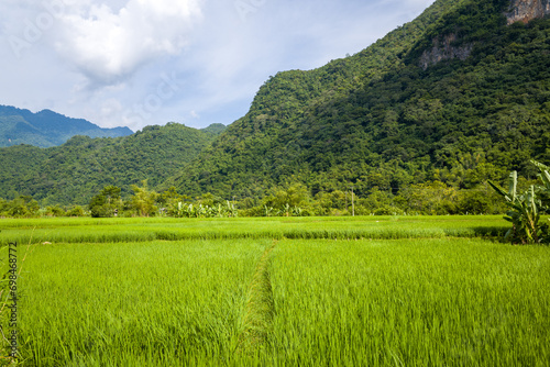 Fototapeta premium The mountains around the green rice fields in the valley, Asia, Vietnam, Tonkin, towards Hanoi, Mai Chau, in summer, on a sunny day.
