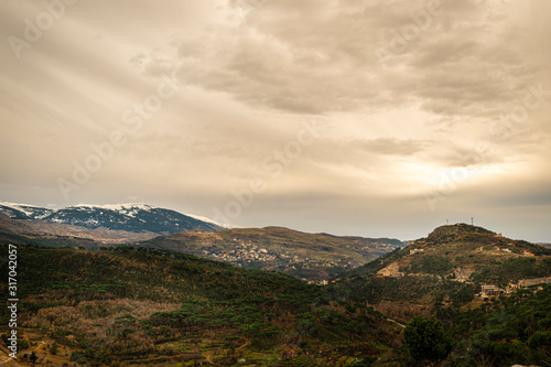 Naklejka premium The mountains of Lebanon were once shaded by thick cedar forests and tree is the symbol of country. Beautiful landscape of mountainous town in winter, Eco tourism, Chouf district with large vistas