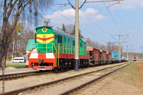 © eillen1981, Fototapeta premium The multicolored diesel train on the rails