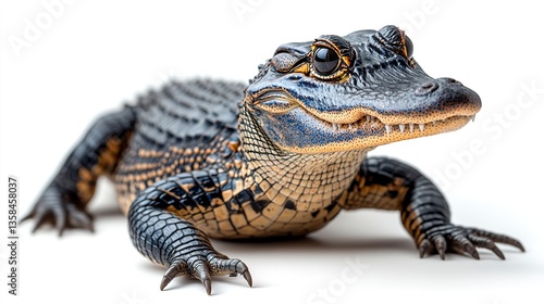 © THUA, Obraz premium The muscular body and armored back of an American alligator, isolated against white. Soft shadows add depth to its lifelike texture. Studio lighting, detailed realism.