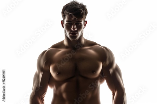 Fototapeta premium The muscular, shirtless bodybuilder poses confidently, showcasing his strong...