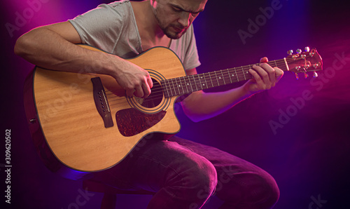Obraz premium The musician plays an acoustic guitar. Beautiful background with colored light rays.