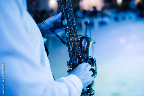 © Alexander, Fototapeta premium The musician plays the saxophone indoors close-up. The saxophonist plays the saxophone at the event close-up.