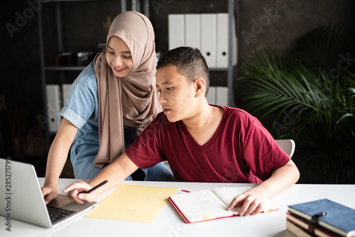 © Watcharin, Obraz premium The muslim student doing paper work together,using laptop for searching data,at meeting room,blurry light around