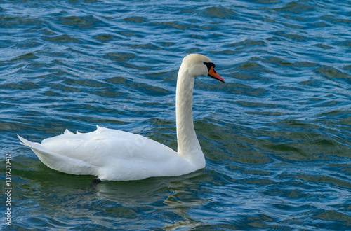 Naklejka premium The mute swan - Cygnus olor, large white waterfowl swims in the sea bay near Odessa, Ukraine