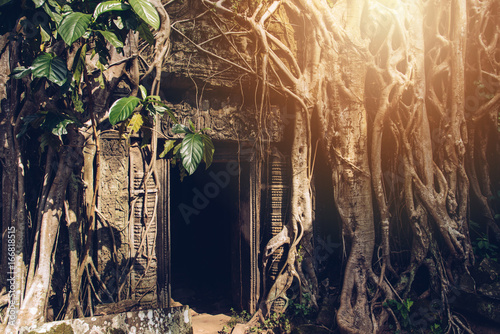 Obraz premium The mystery entrance door in Ta Prohm temple an iconic tourist attraction...