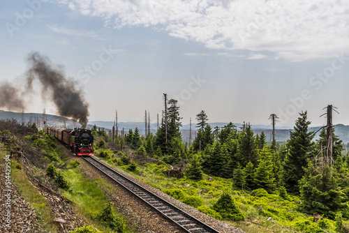 © Daniela Baumann, Obraz premium The narrow-gauge railway Brockenbahn in the German low mountain range Harz drives up the highest mountain Brocken.