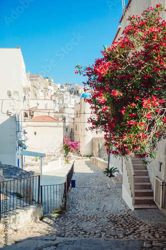 Naklejka premium The narrow streets of the island with blue balconies, stairs and flowers.
