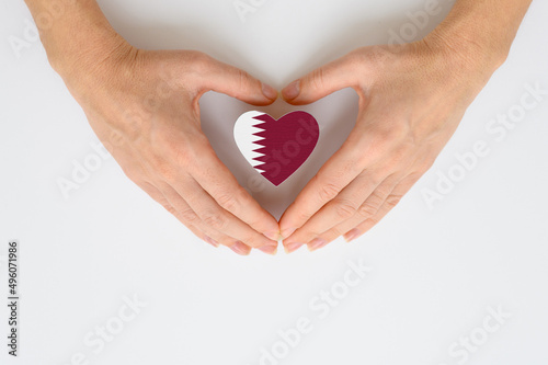 © Nikita, Fototapeta premium The national flag of Qatar in female hands.