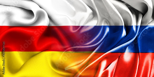 © Vladimir, Fototapeta premium The national flags of Russia and South Ossetia are combined into one and placed side by side on a fluttering cotton background. Flags.